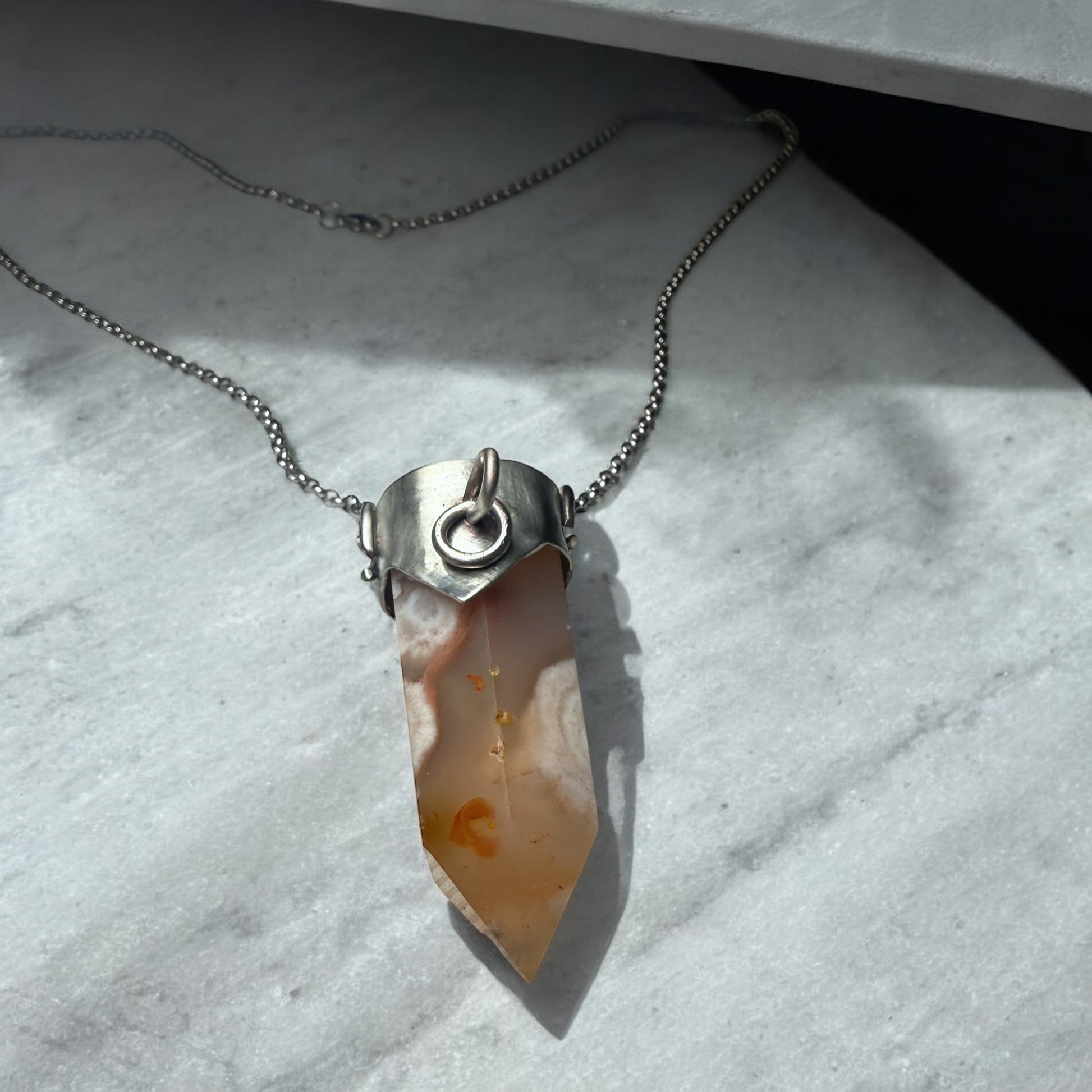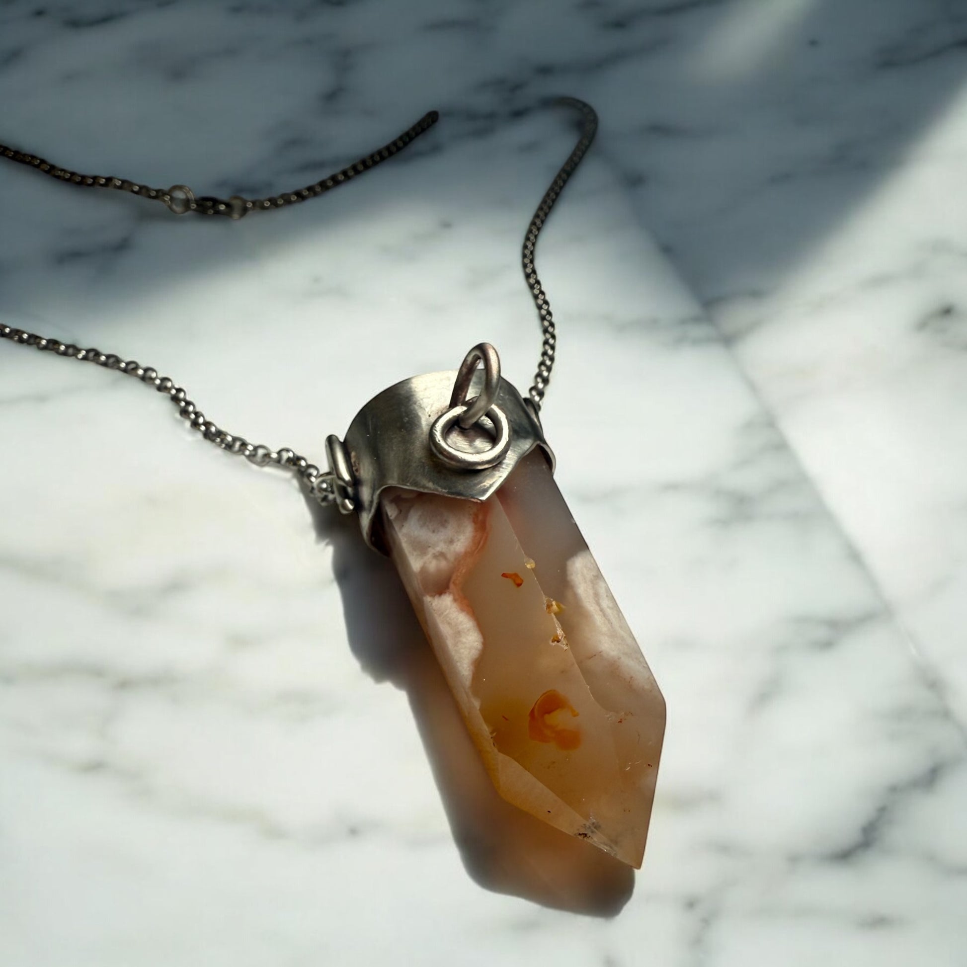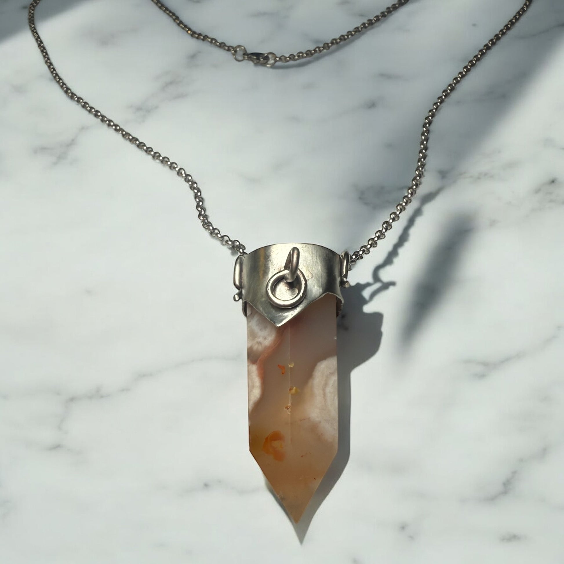 A fusion of protection and growth, the Blossomguard Talisman pairs the soft, nurturing energy of flower agate with the strength of a shield-bound setting. Known for its dreamy patterns and druzy pockets, flower agate is a stone of personal evolution — encouraging new beginnings, emotional healing, and the courage to bloom into your full potential. The shield setting amplifies this meaning, standing as a symbol of protection and resilience. Suspended from a 12-inch adjustable chain (custom lengths available upon request), this piece is both armor and amulet, a guardian for those ready to grow through what they go through.