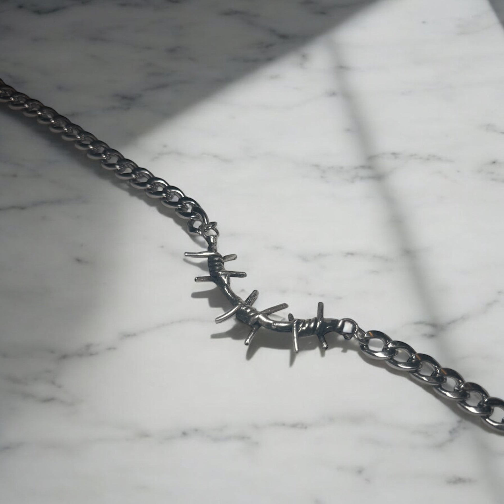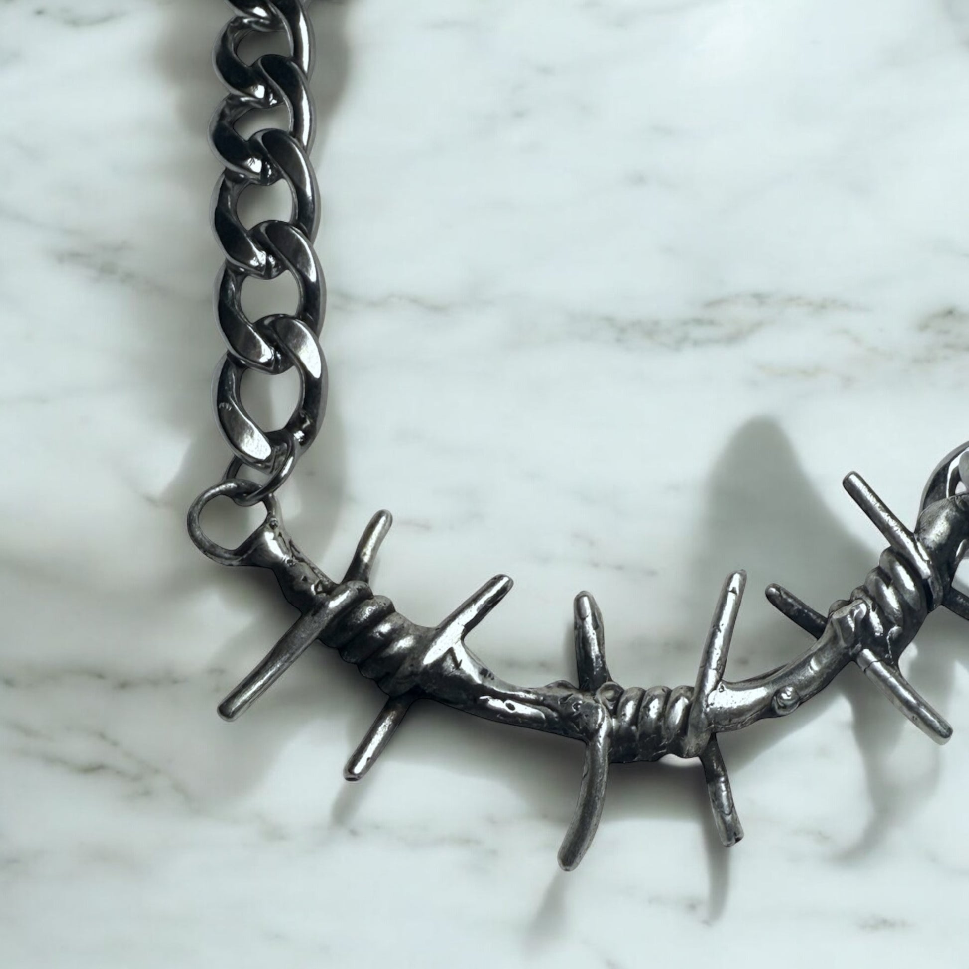 A bold reimagining of a signature favorite—this Barbed Wire Necklace features a solid sterling silver construction with a refined, heavier chain that perfectly balances the raw edge of the barbed wire centerpiece. It comes with a 10-inch chain length, designed to sit as a shorter statement piece, but can be customized to your preferred length. Handcrafted and ready to ship.