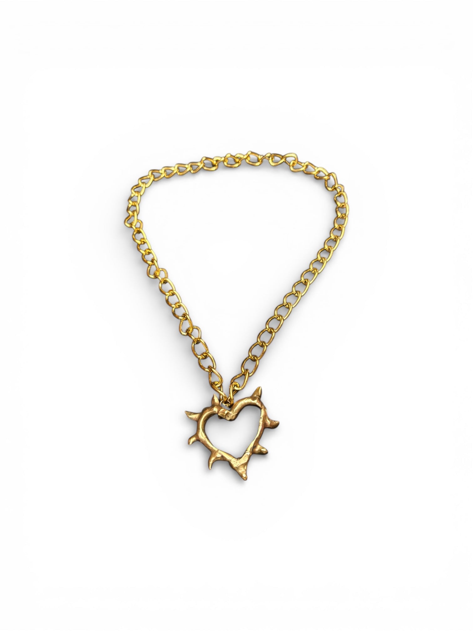 A small heart caught in thorns protection and devotion intertwined. Hand-cast and suspended on chunky chain for statement layering. A subtle piece with bite.