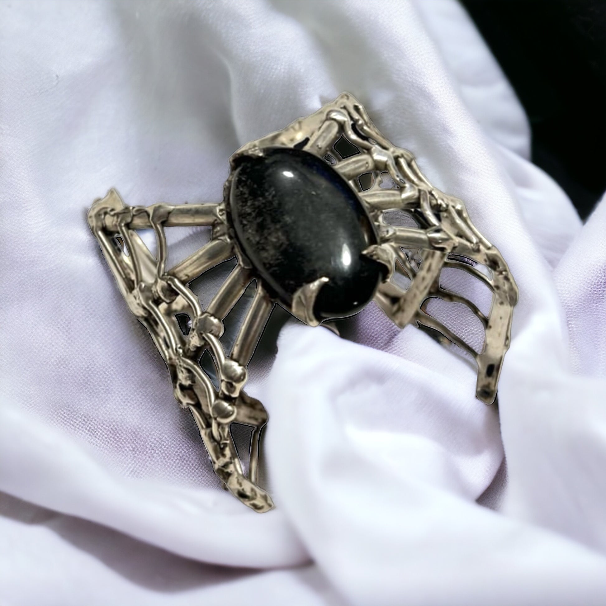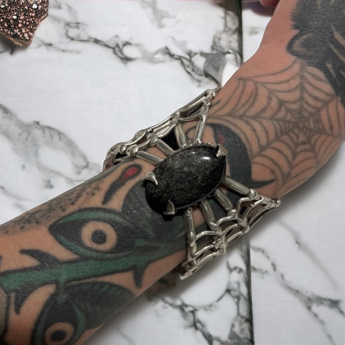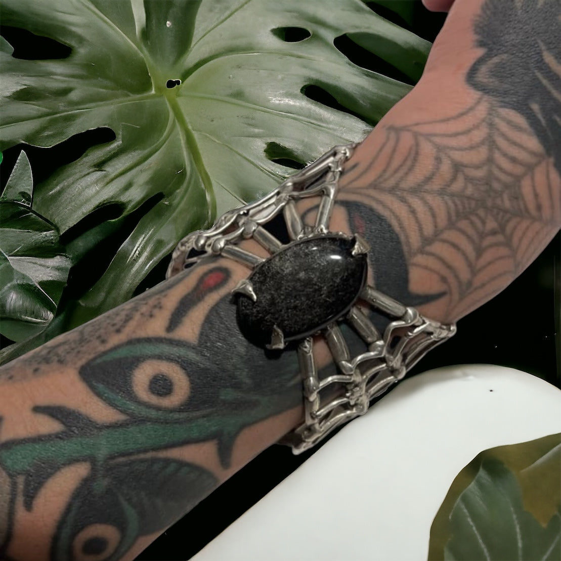 The Obsidian Venom Cuff is a handcrafted sterling silver cuff inspired by the duality of life and the spider's ability to repel negativity with its web. This unique piece features a hand-carved obsidian stone and a web-like design that symbolizes expansion. Perfect for wrist sizes of all sizes, this cuff offers not only stunning style, but also powerful protection.