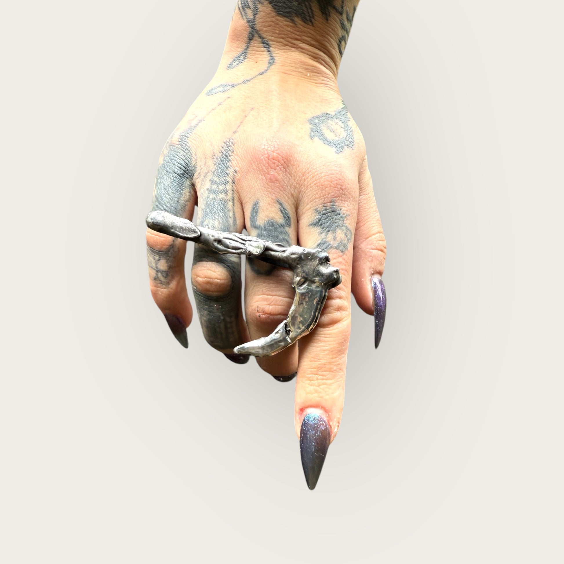 Discover the edgy and versatile Summer Scythe Ring, inspired by brass knuckles. Hand-carved and aged bronzed, its unique design makes for easy stacking or stunning solo wear. Available in various sizes and also in Sterling Silver.