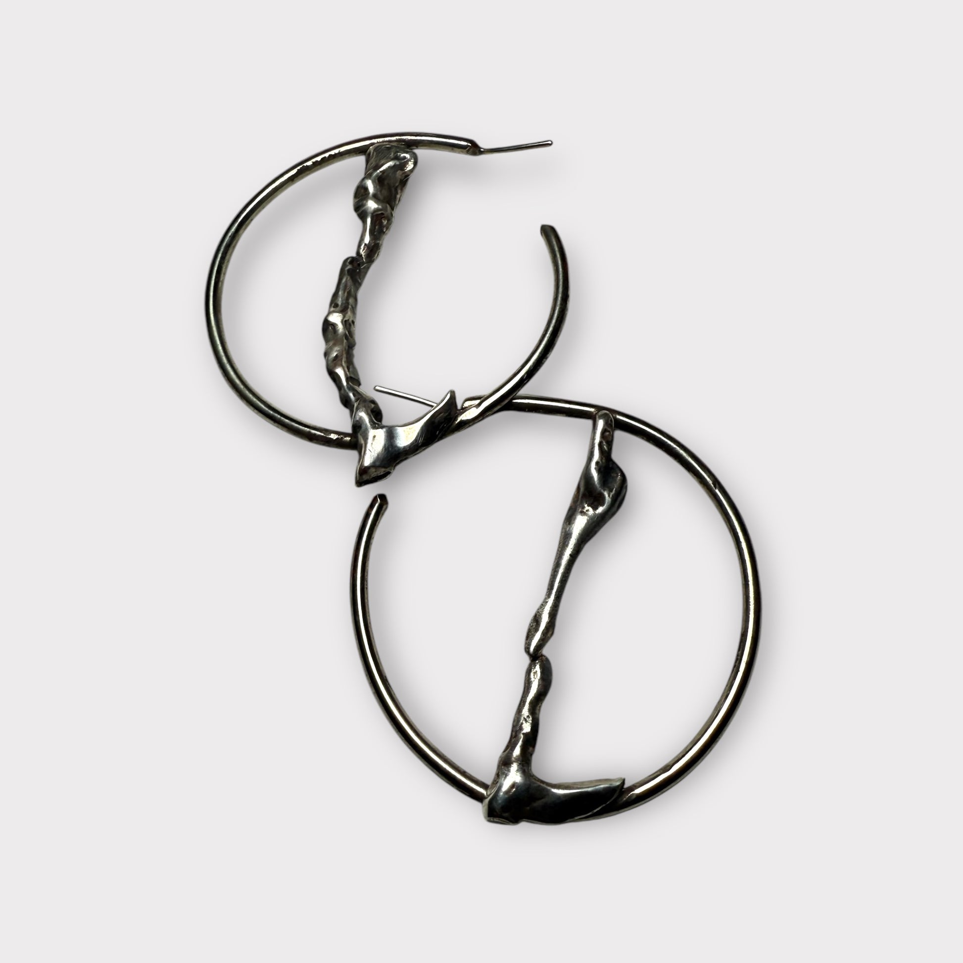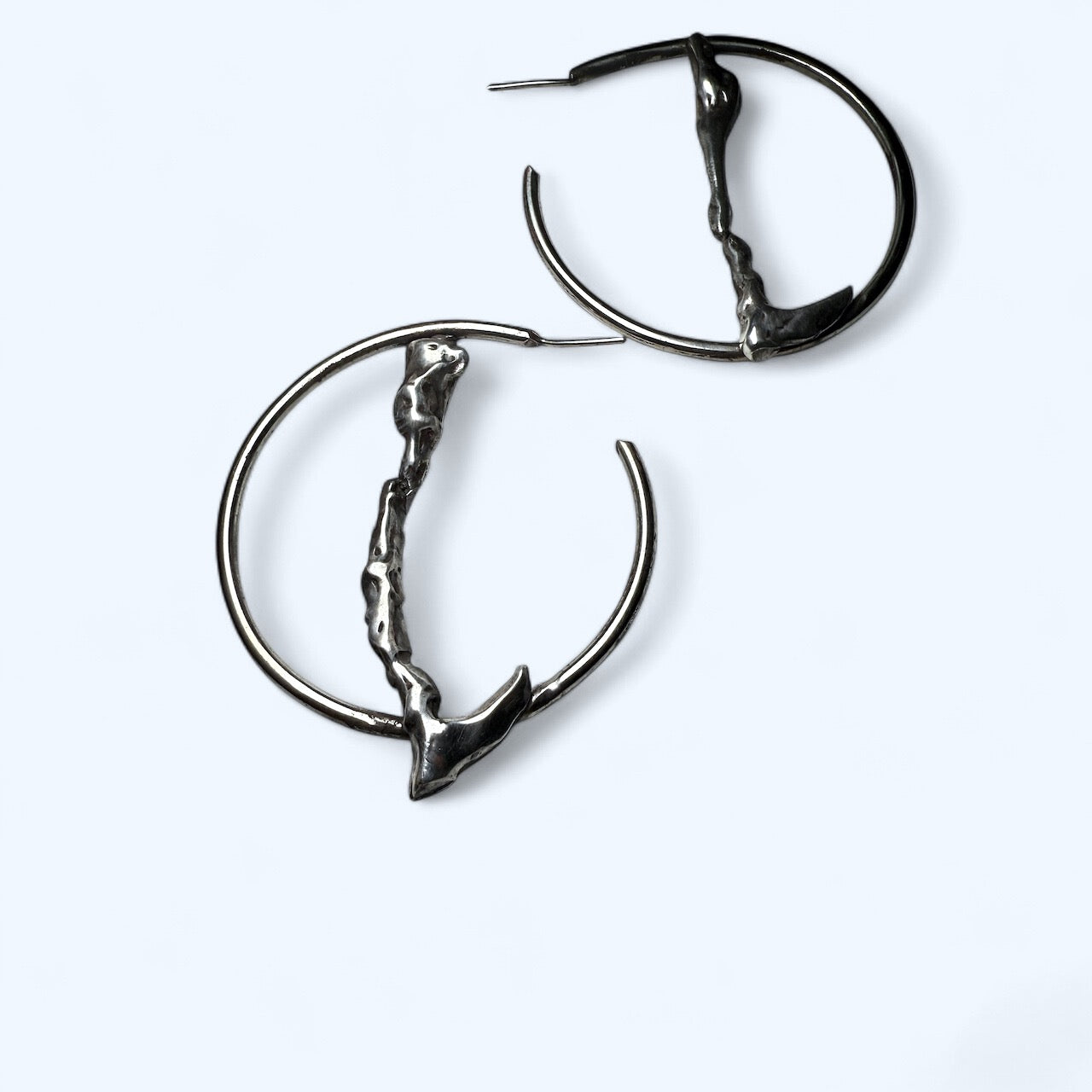 These Reaper’s Embrace hoops are hand-cast in sterling silver, featuring a bold scythe-inspired design. At 70mm, they make a striking statement while embodying power and edge. One-of-a-kind and ready to ship.
