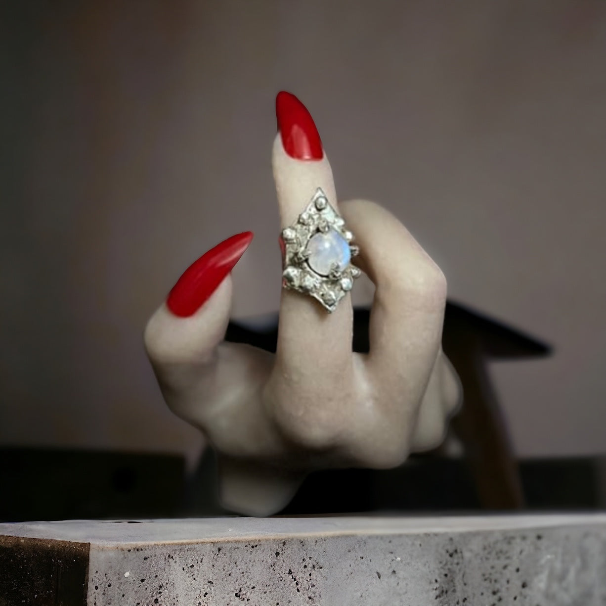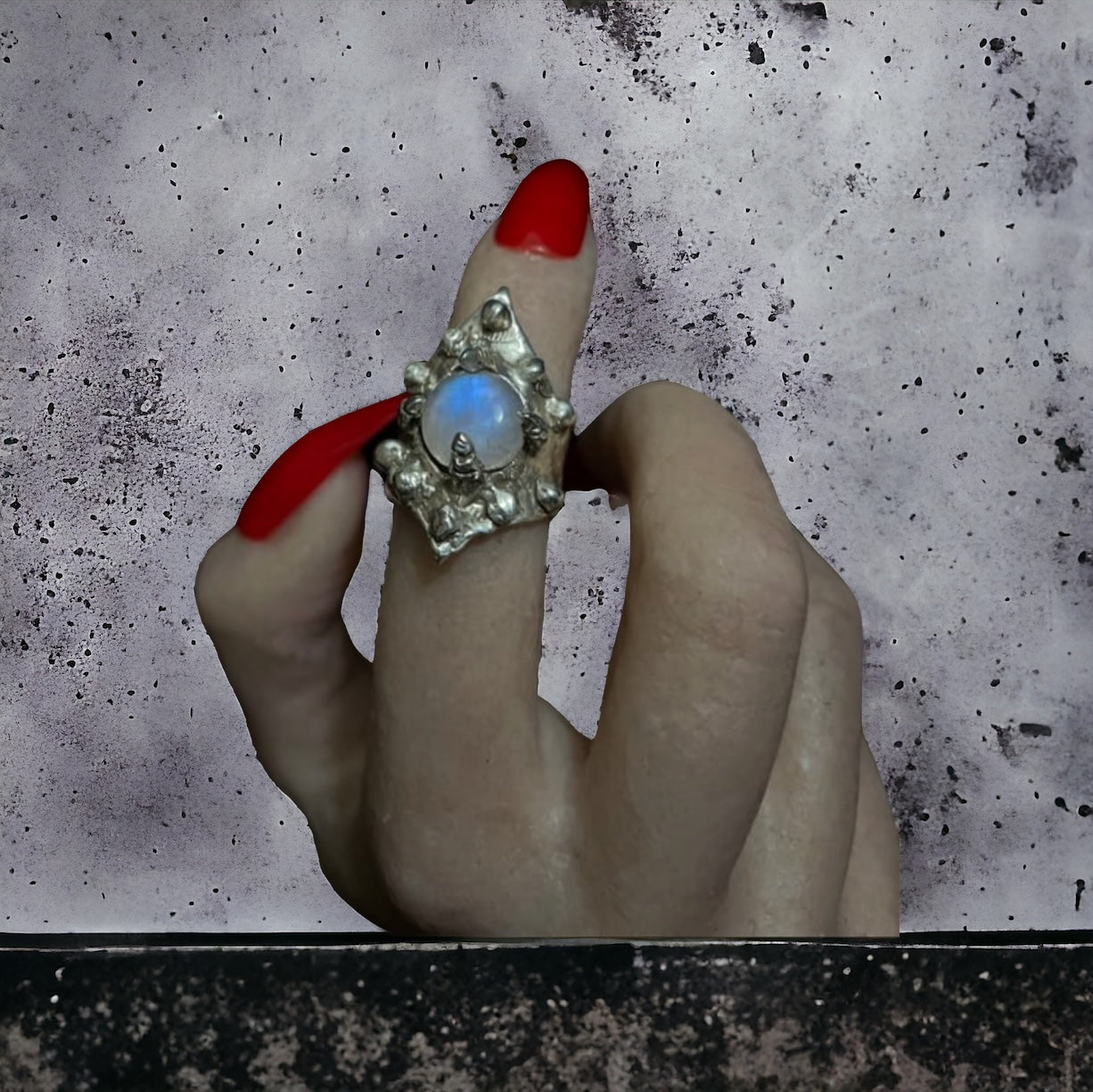 Introducing our hand carved seer ring, featuring a stunning rainbow moonstone. Made with high quality sterling silver, this ring is available in three sizes. Simply specify your ring size during checkout. Experience the beauty and craftsmanship of this unique piece.