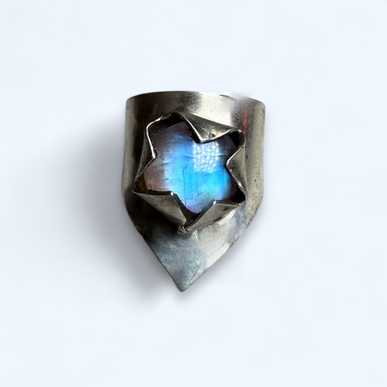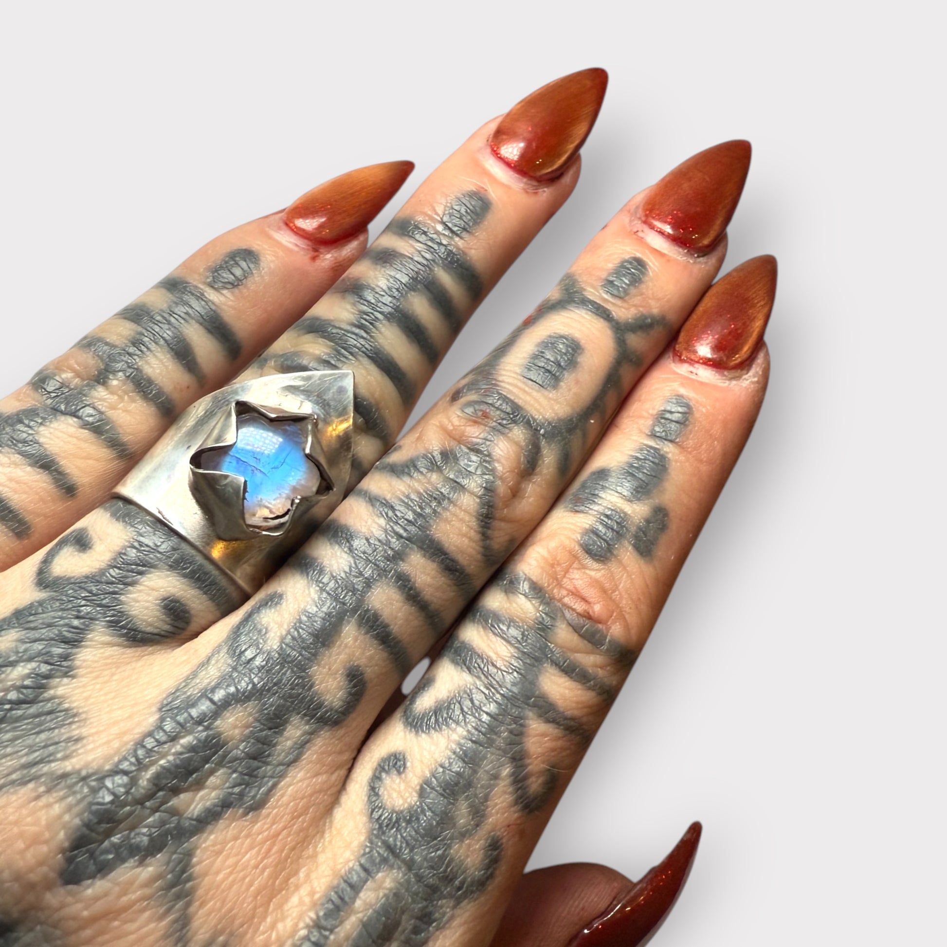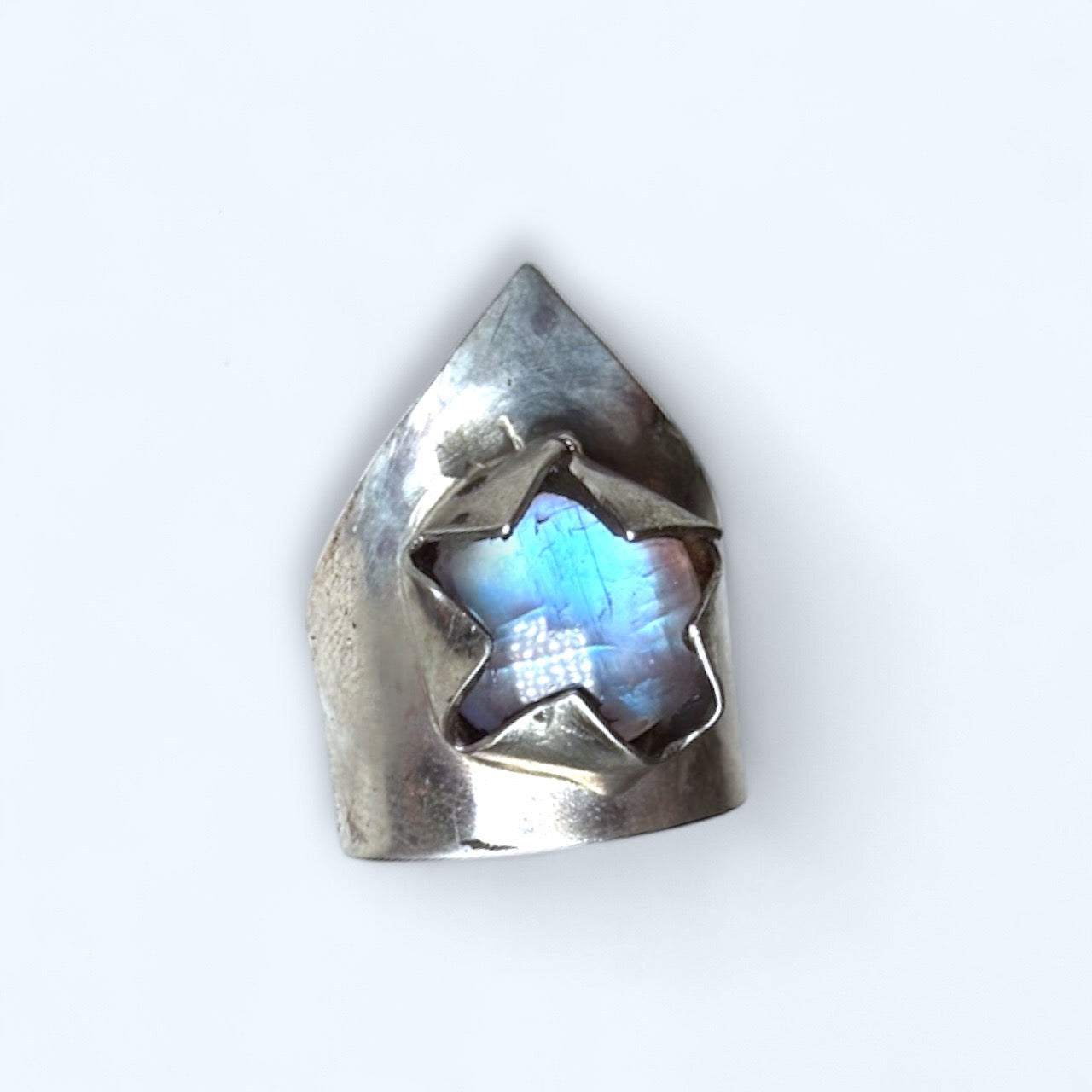This one-of-a-kind Selene’s Veil ring is crafted in sterling silver, showcasing a mesmerizing rainbow moonstone. Known as the stone of new beginnings, rainbow moonstone enhances intuition, promotes emotional healing, and balances energies. Ready to ship and available now.