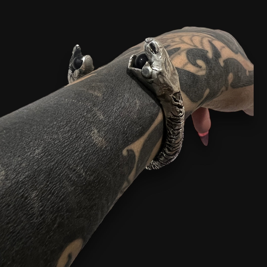 Crafted from sterling silver, the Serpent Cuff Obsidian is a powerful accessory inspired by the Divine feminine. Its hand-carved serpents symbolize strength and rebirth, while the obsidian spheres provide protection from negativity. Embrace its mystical energy and elevate your style.
