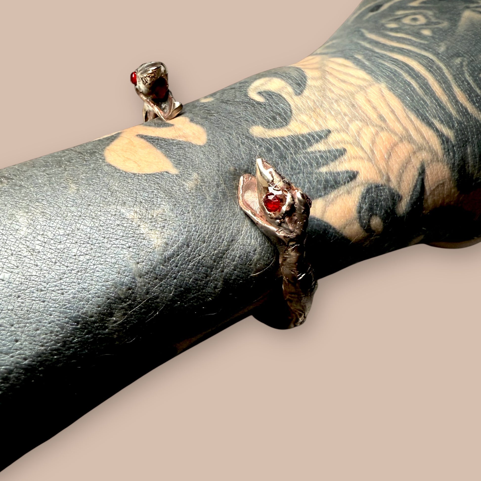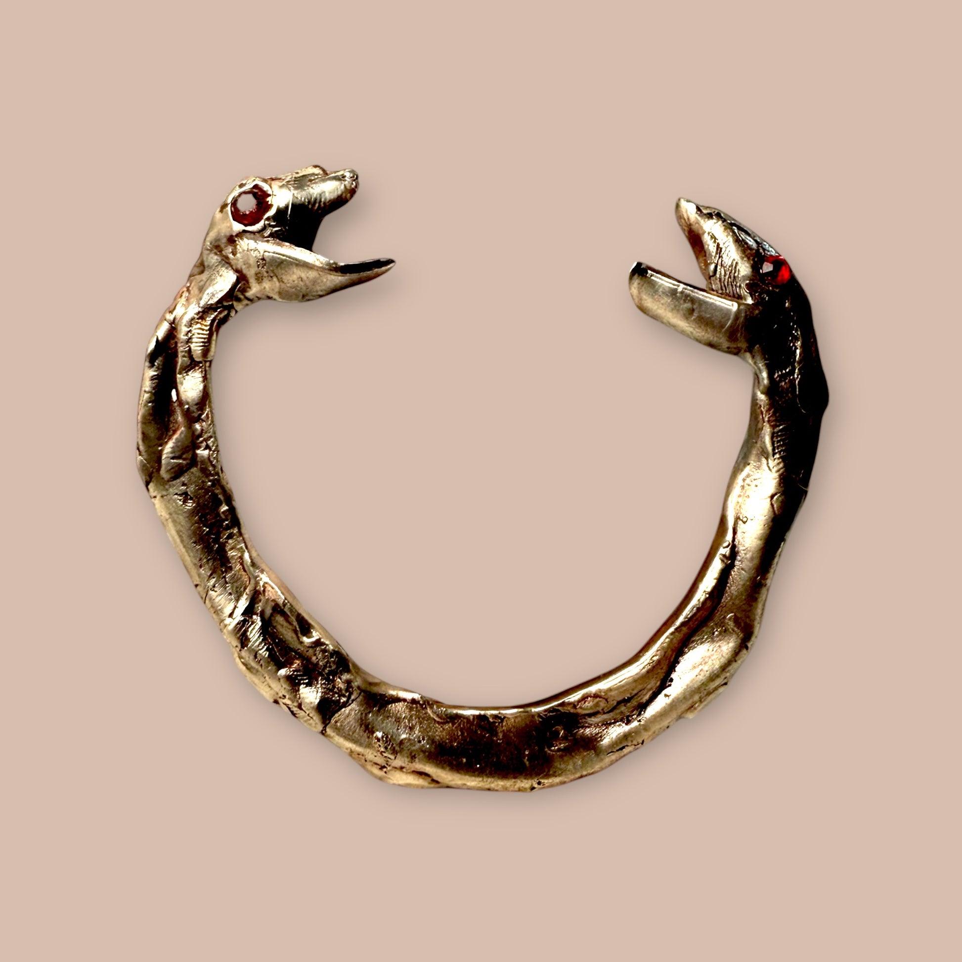 Embrace the mystique of transformation with the Serpent’s Gaze Cuff. Hand-carved in wax and cast in aged bronze, this medium-sized cuff features faceted garnet eyes that symbolize passion and vitality. The serpent, a timeless emblem of rebirth and healing, is intricately detailed to wrap gracefully around your wrist. After purchase, please email your wrist size to ensure a tailored fit.