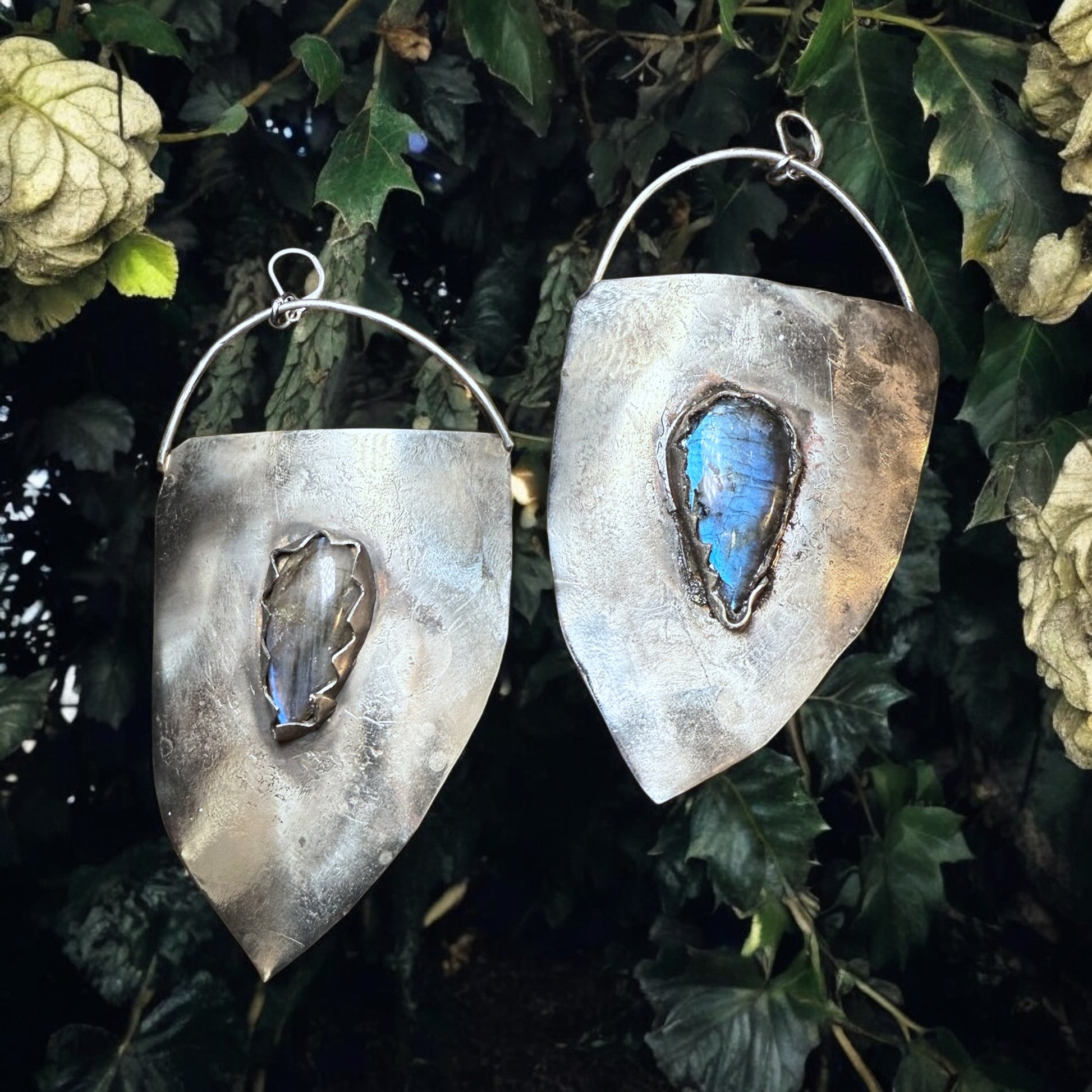 Forged in honor of Hecate, goddess of the crossroads and hidden realms, the Shield of Hecate Earrings are powerful yet lightweight statement pieces. Featuring large brass shields with custom bezel-set labradorite—known for its protective and intuitive properties—these earrings shimmer with ethereal blues and greens. Designed with sterling silver French hooks and light enough for stretched ears, they can also be worn as beginner weights for those embracing their next transformation.