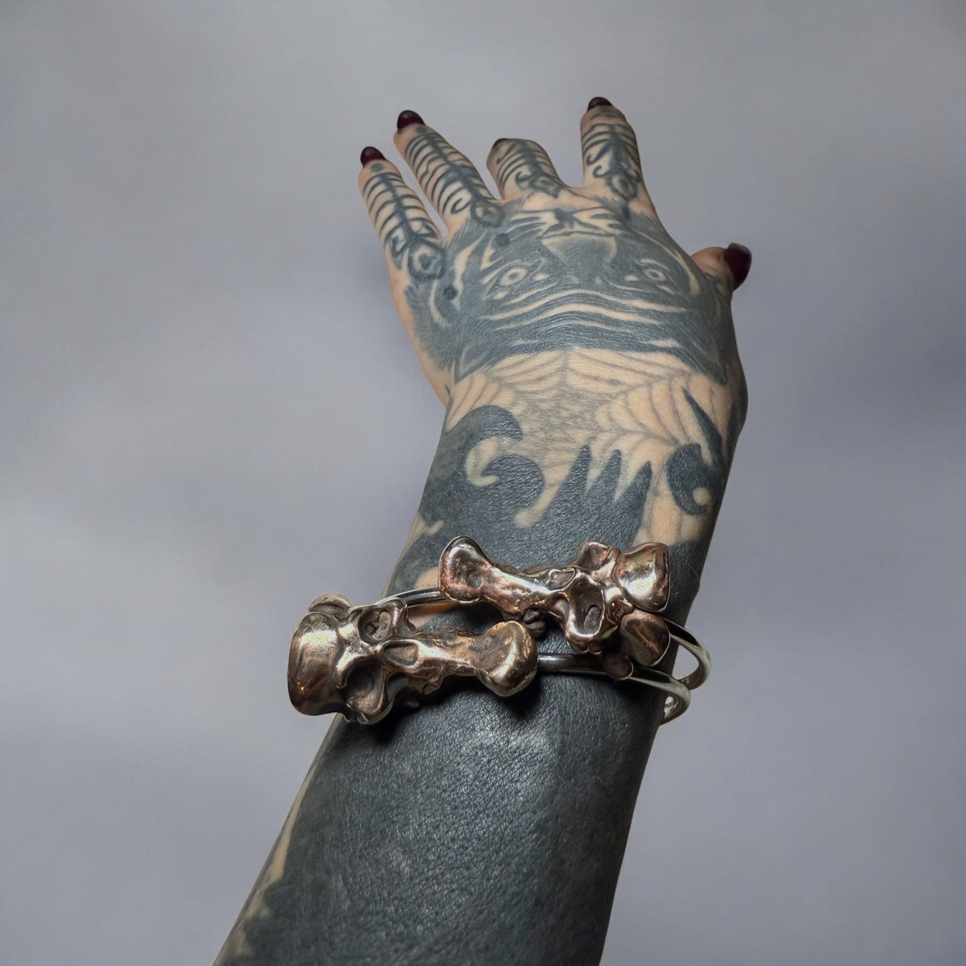 Hand-carved mixed metal skull cuffs that adjust to any wrist size. Drawing inspiration from the Flying Head of Japanese mythology, these stackable cuffs embody movement, transformation, and ancient spirit energy. Ideal for customers seeking adjustable cuffs, skull bracelets, and handcrafted mixed-metal jewelry.