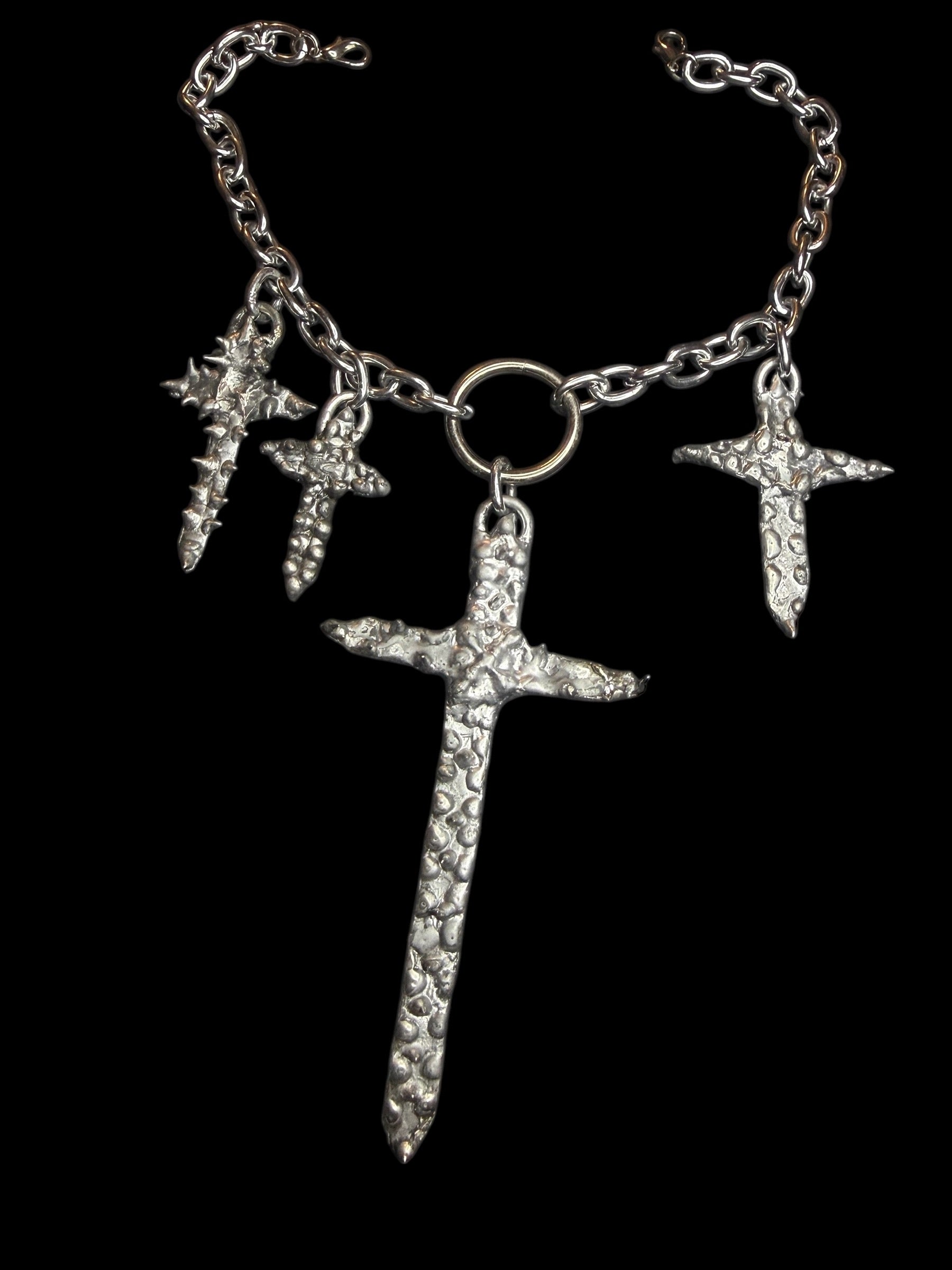 This chain comes fully adorned with an assortment of one-of-a-kind crucifixes, each individually cast and arranged into a single brutalist statement.