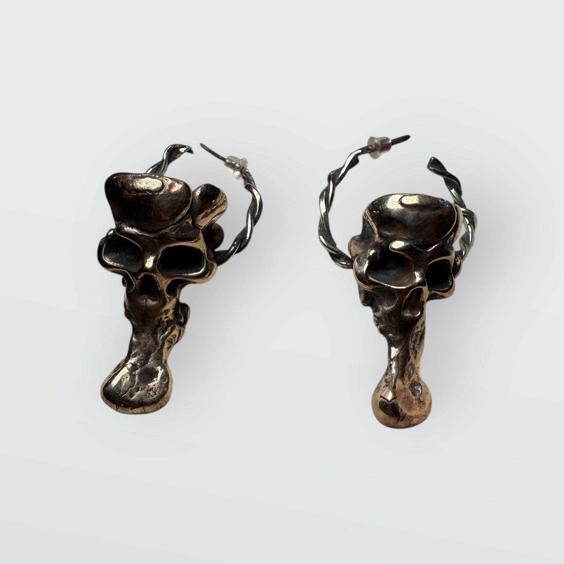 Hand-twisted 30mm hoops featuring miniature hand-carved skulls inspired by the Flying Head spirit of Japanese folklore. Made in mixed metals (sterling and brass), these lightweight hoops blend sculptural detail with everyday wearability. Perfect for fans of artisan hoop earrings, skull jewelry, and occult-inspired designs.
