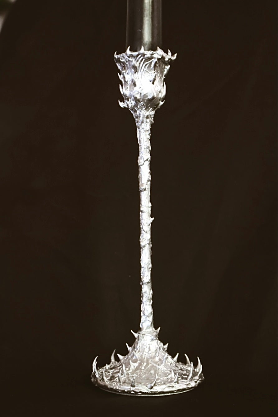 A brutalist metal candle holder forged with jagged spikes and a hammered web foundation. Each piece is handmade, offering a raw and powerful presence.