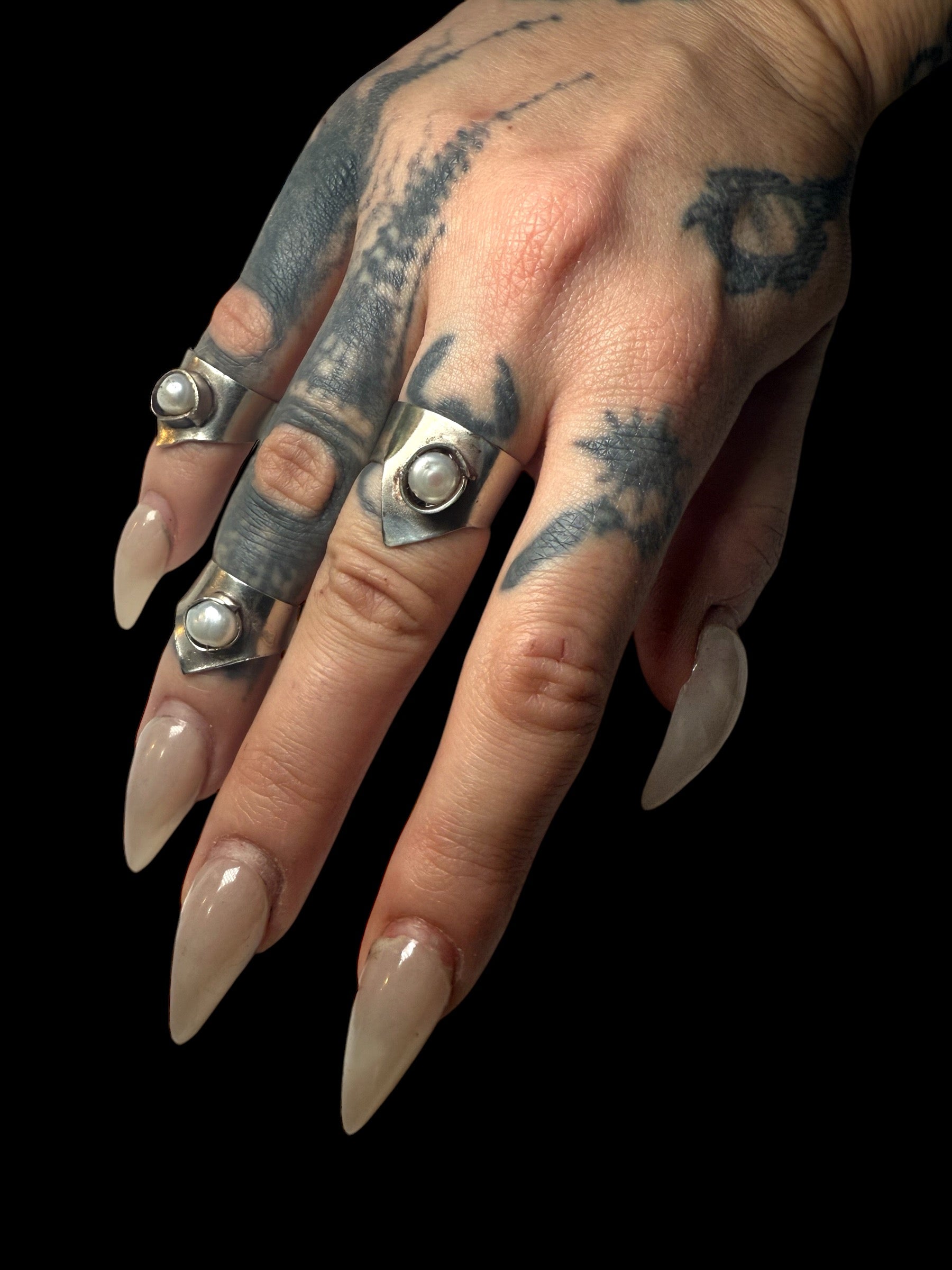 Forged in the spirit of ancient warriors, the Vanguard Shield Rings are symbols of protection and power. Carved in sterling silver and crowned with the iridescence of mother of pearl, these rings channel the stone’s legendary properties of intuition, strength, and emotional balance. Revered since ancient times for its connection to the ocean’s wisdom, mother of pearl carries the essence of both armor and amulet. Adjustable and available in a variety of sizes, these freeform-cast rings stand as shields for the modern sorcerer — guarding your energy with elegance and edge.